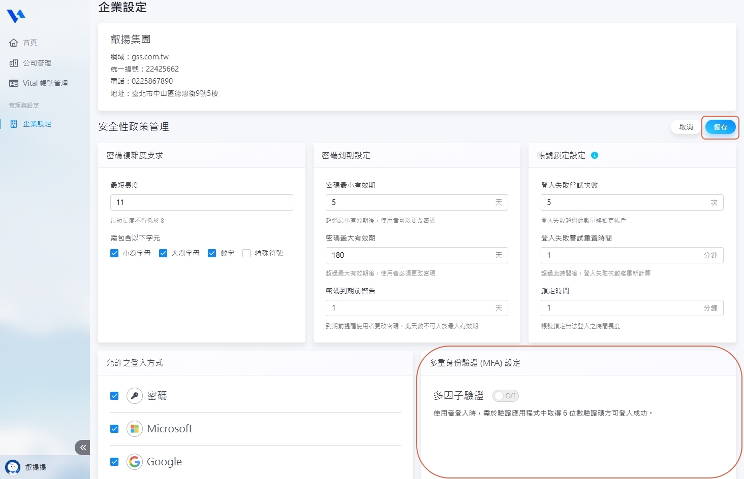 6. 【MFA設定】可設定開啟或關閉,若設定開啟,員工須自行至帳號中心綁定手機驗證軟體。以上設定皆完成後請務必點選【儲存】保存設定。
