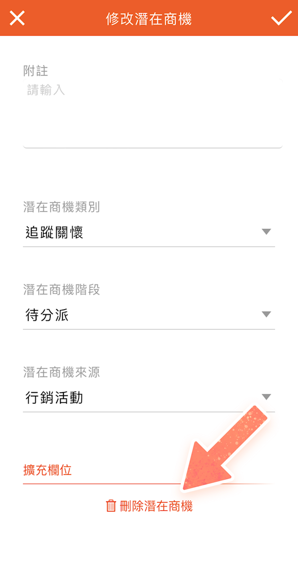 先從潛在商機列表中找到想要刪除的潛在商機,點選名稱進入詳細頁面後,點右上方的編輯圖示,之後把畫面拉到最下方,點選刪除按鈕。