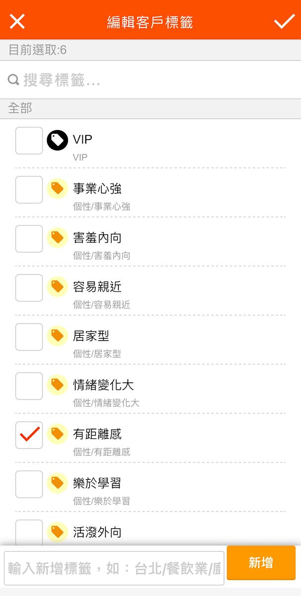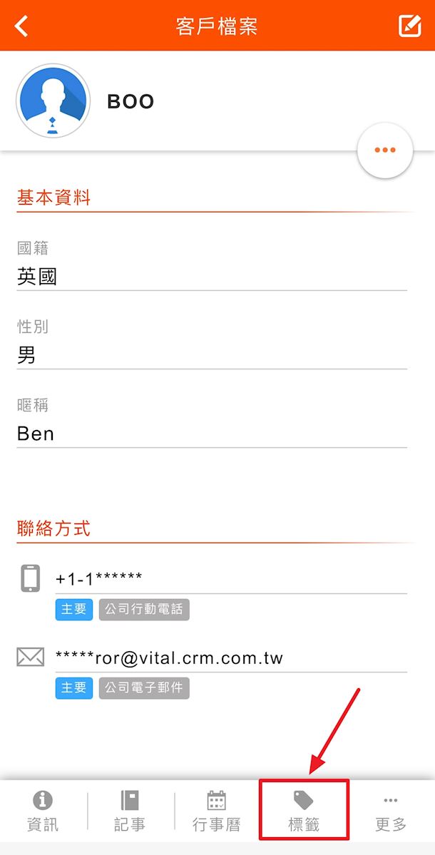 行動裝置使用APP為客戶貼上標籤,請在選擇欲貼標籤的客戶後,下方列表中點選【標籤】,進入【客戶標籤】頁面,點選右上方的鉛筆,即可開始編輯客戶標籤。