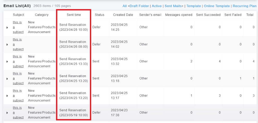 Simply go to the "Marketing Emails" feature, where you can view the scheduled sending time of your marketing emails. If you accidentally saved your email as a template after setting it up, you can go to the top right of the list and click on "Templates" to view it.