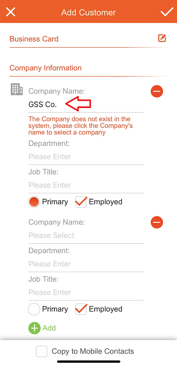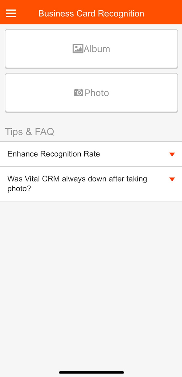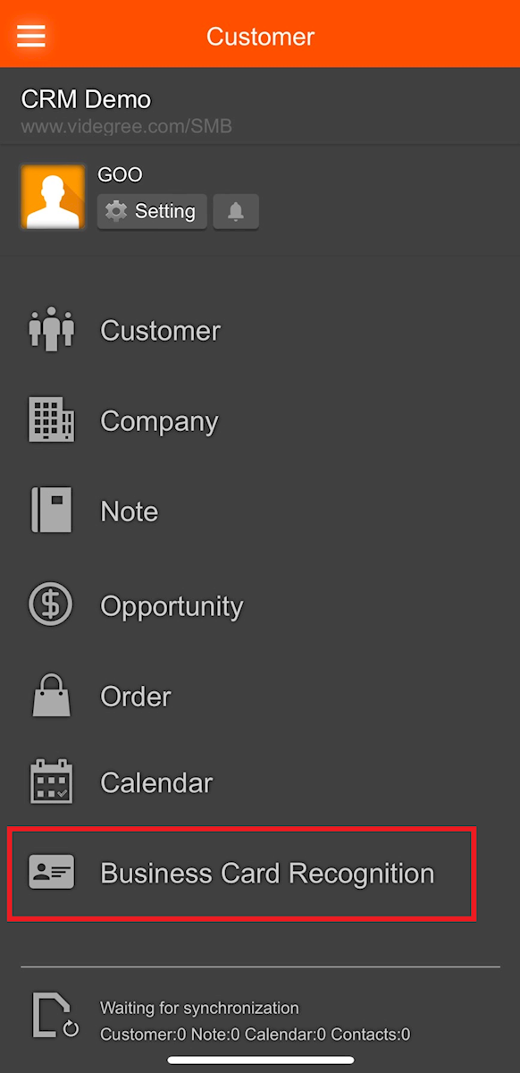 "Business Card Recognition" is a feature that allows you to use your phone's camera to capture information from physical business cards, input it into the system for recognition, and add new customers.