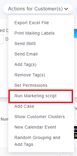 - Batch application: Go to [Customer] tab, click on [Actons] and choose [Run Marketing script] in the drop-down menu.