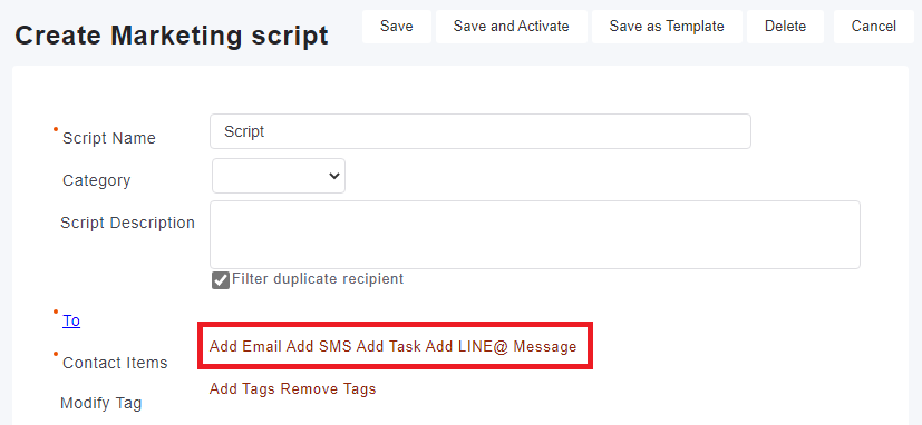 - Add emails and SMS: You can directly edit the content, or apply the templates of "marketing emails" and "marketing SMS" that have been created.