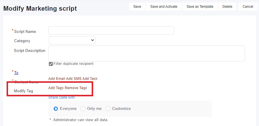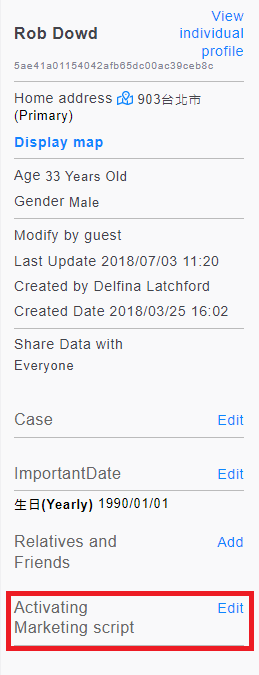 - Single application: In the list on the right side of the customer profile page, find [Active Marketing Script] and click [Edit] to apply the marketing script.