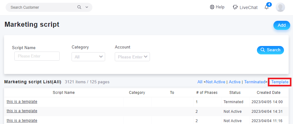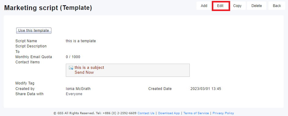 1. Click [Marketing Script], select [Template] on the upper right and select the template you want to edit.