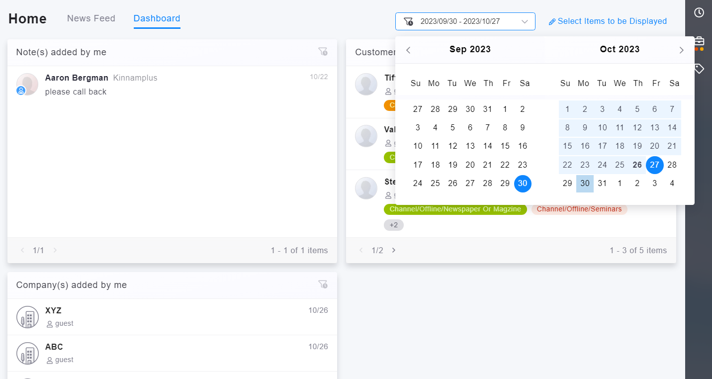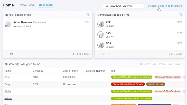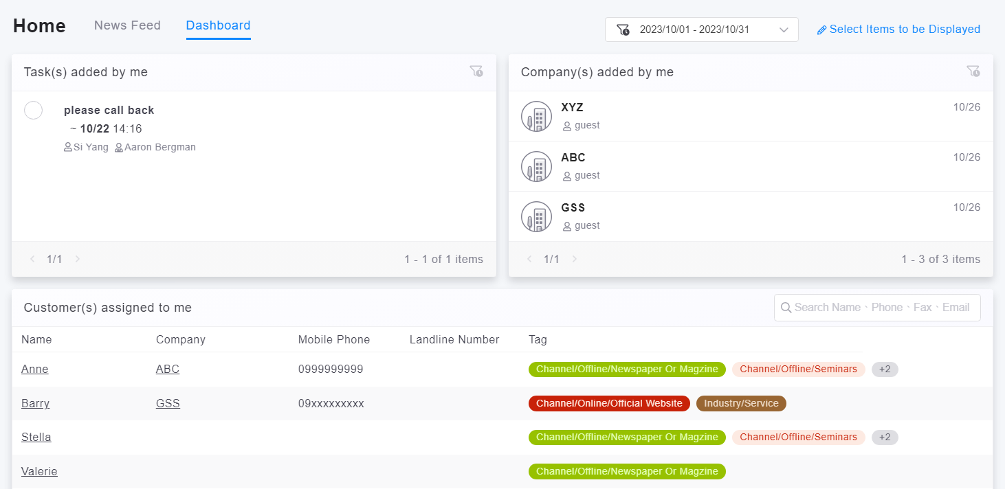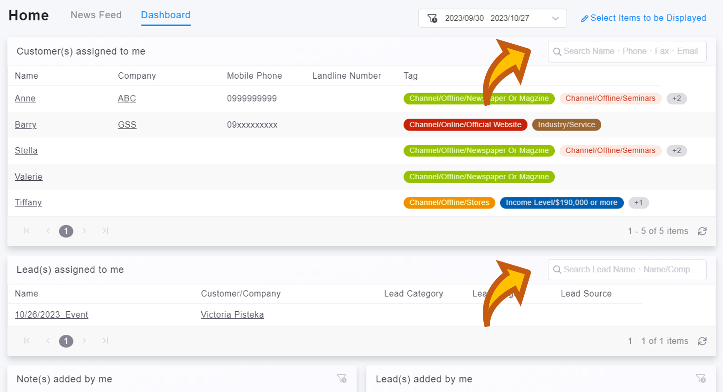 Dashboard allows you to specify a time range for content filtering. For the item related to "Assigned Customers, Companies, Events/Activities, Potential Opportunities, and Opportunities," there will be a search bar in the upper right. You can enter keywords to search.