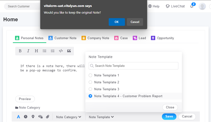 7. Click OK to keep the original message, the template content will be added after the original note content.