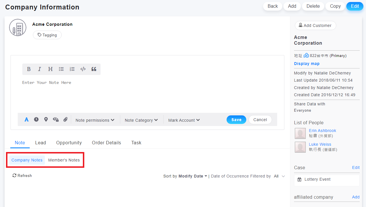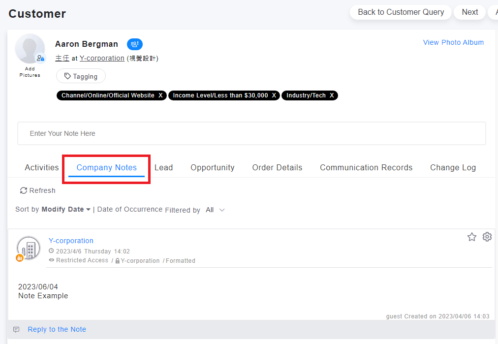 In the customer information tab, a new page of "Company Notes" is added, and you can view the notes of the company to which the customer belongs