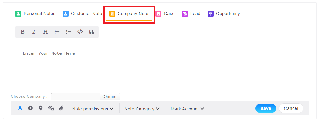 Select "Company Notes" type on the note section, then select the company and enter the content of the note.