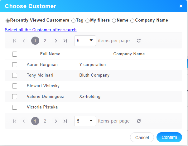 2. The system will pop up a window for selecting customers, where you can select customers based on recent browsing history, tags, my conditions, name/contact person, or company name.