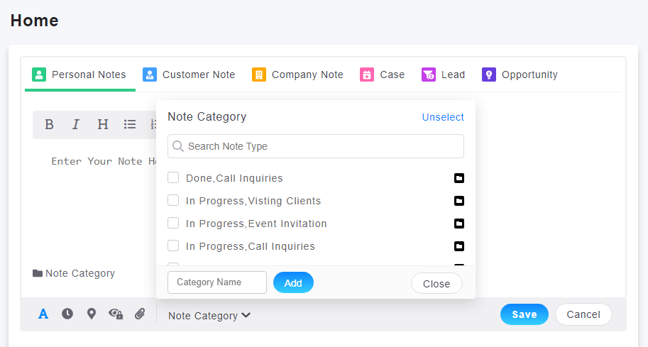 If you don't want to miss any important information in communication with customers, you can use the function of Vital CRM, "Notes". In addition to recording the content of communication with customers, you can also classify the records. You can review them in the future, and you can filter by time and category, to quickly find out the conversation records between you and your customers.