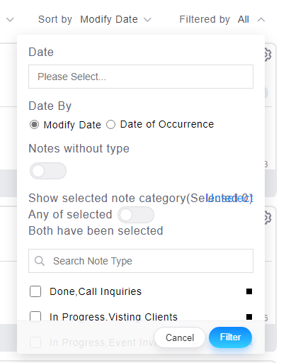 Click [Filters] at the bottom of note text box on the home page. From here you can filter your notes by date, date modified, or note category.