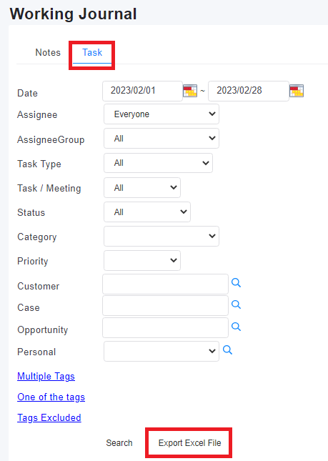 2. In the [Task] tab, input search criterias to filter out the desired data then click [Export Excel File] to export the data.