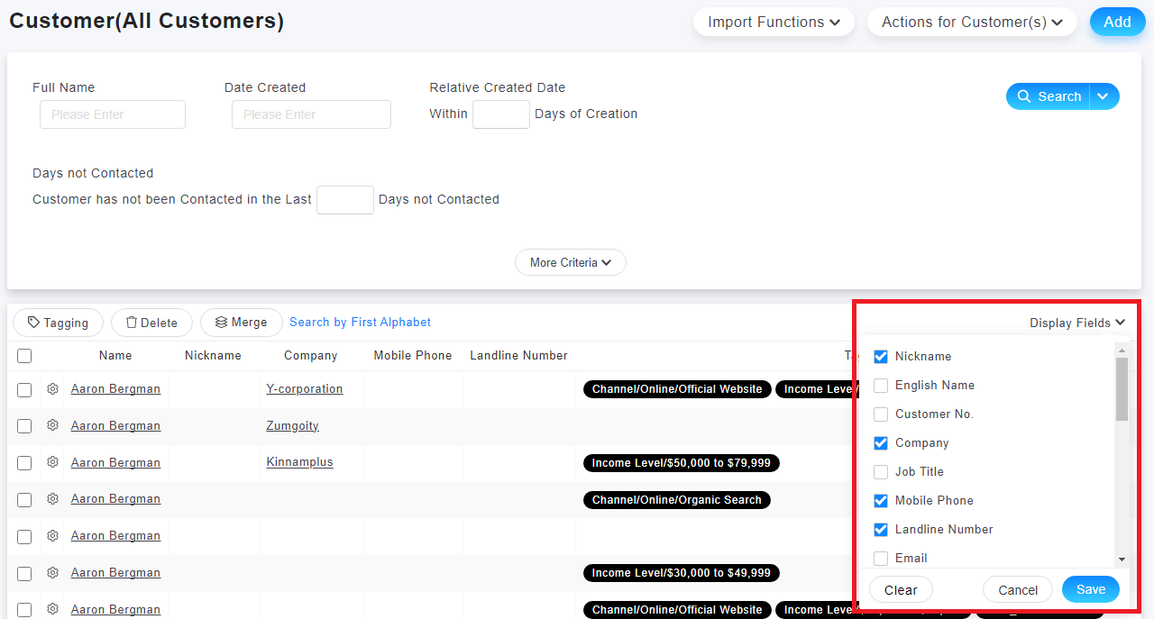 1. Go to [Customer > Display Fields]. You can tick the customer fields you want to display and click save.
