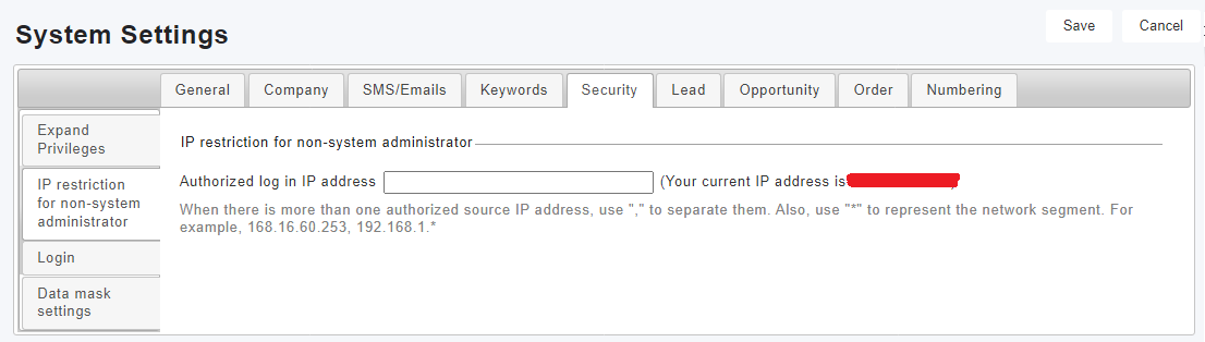 *If after [Authorized log in IP address] has been activated, you get the error 'Login failed, your current IP address is restricted to access the system!', you can contact the administrator to whitelist your own IP address.