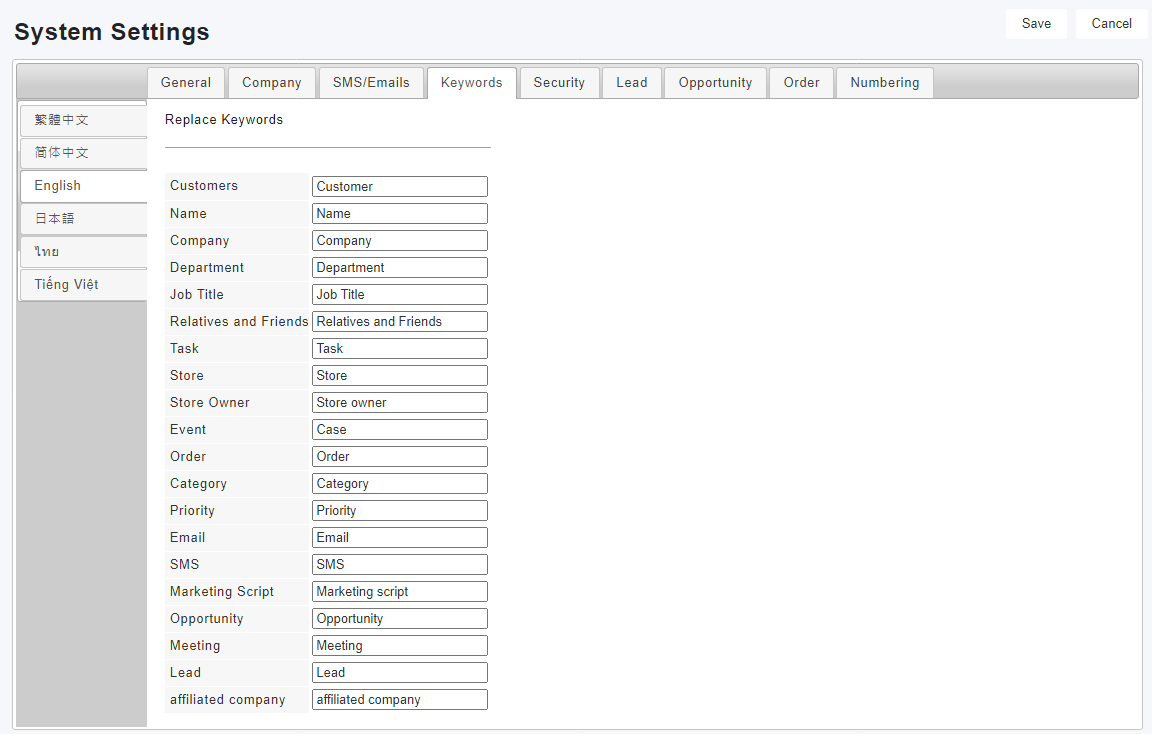 Go to [Settings > System Settings > Keywords] to modify. You can select other languages as well.