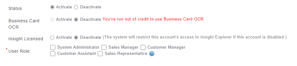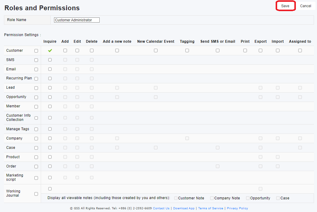 * Note: Original permissions of default role, including system administrator, marketing manager, etc., cannot be edited. If you would like to open certain permissions for default roles, you can follow previous operation to add a customize role. Users could both have permissions of default role and customize role.