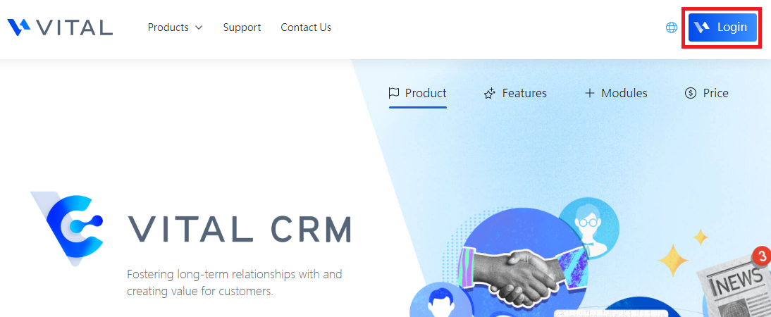 1. Enter the Vital CRM GSS website, and click login on the upper-right corner of the page.