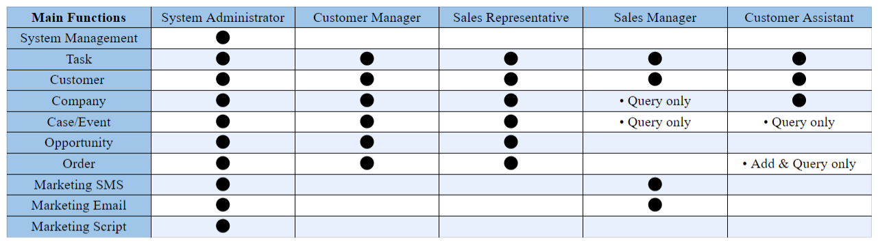 Our service provide some variant roles in CRM system: System Administrator, Marketing Management, Customer Manager, Customer Assistant, Sales. You can select multiple roles when you add a new account.