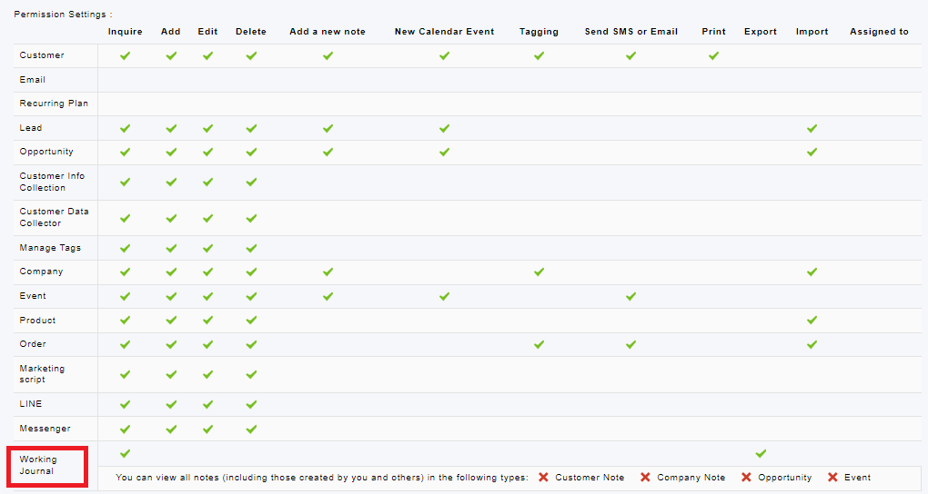 *Due to data security reasons, note export uses the same role permissions as the work journal (as shown below). If you do not have the permission to export notes, you can contact your system administrator to edit permissions.