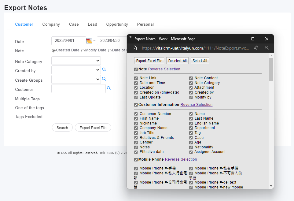 3. Select the note type (customer/company/opportunity/event/personal), enter the search criteria, and select the desired fields for export.