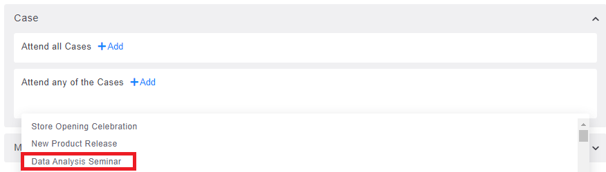 1. Go to [Customer > More criteria]. Click [Case], choose your case/event in [Attend any of the Cases] / [Attend All Cases], and click [Search] to get the list of participants of the case.
