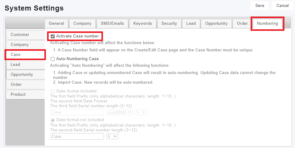 Click [Settings > System > System Settings > Numbering > Case/Event], you can tick "Enable Event/Case Numbering", "Enable Event/Case Automatic Numbering" and set rules here.