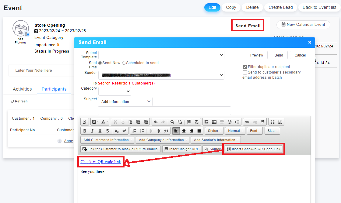 Click [Send Email] on the upper right of the event page to send an email to the participants of the event. When writing the email content, you can click "Insert Check-In QR code link".