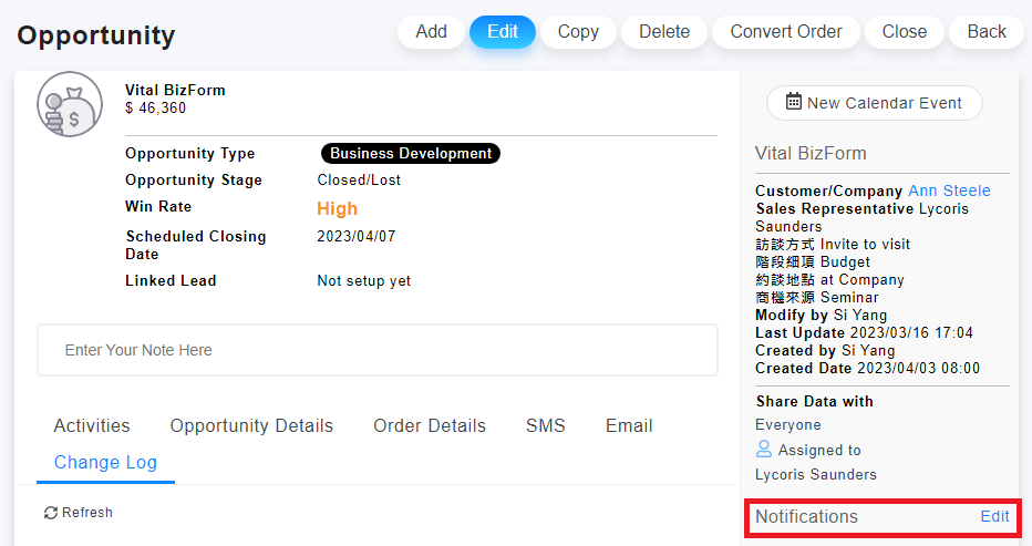 2. Click "edit" on the right to enable, disable or edit the additional notifications. (all types of notification letters are sent to the sales representative by default, and the additional notifiers will receive a copy or to join, so if the sales representative is not set, the notification cannot be set, and the system will send a prompt message)