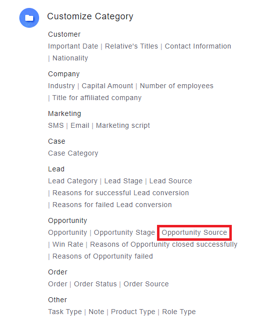 1. Go to [Settings > Customize Category > Opportunity Sources] to add