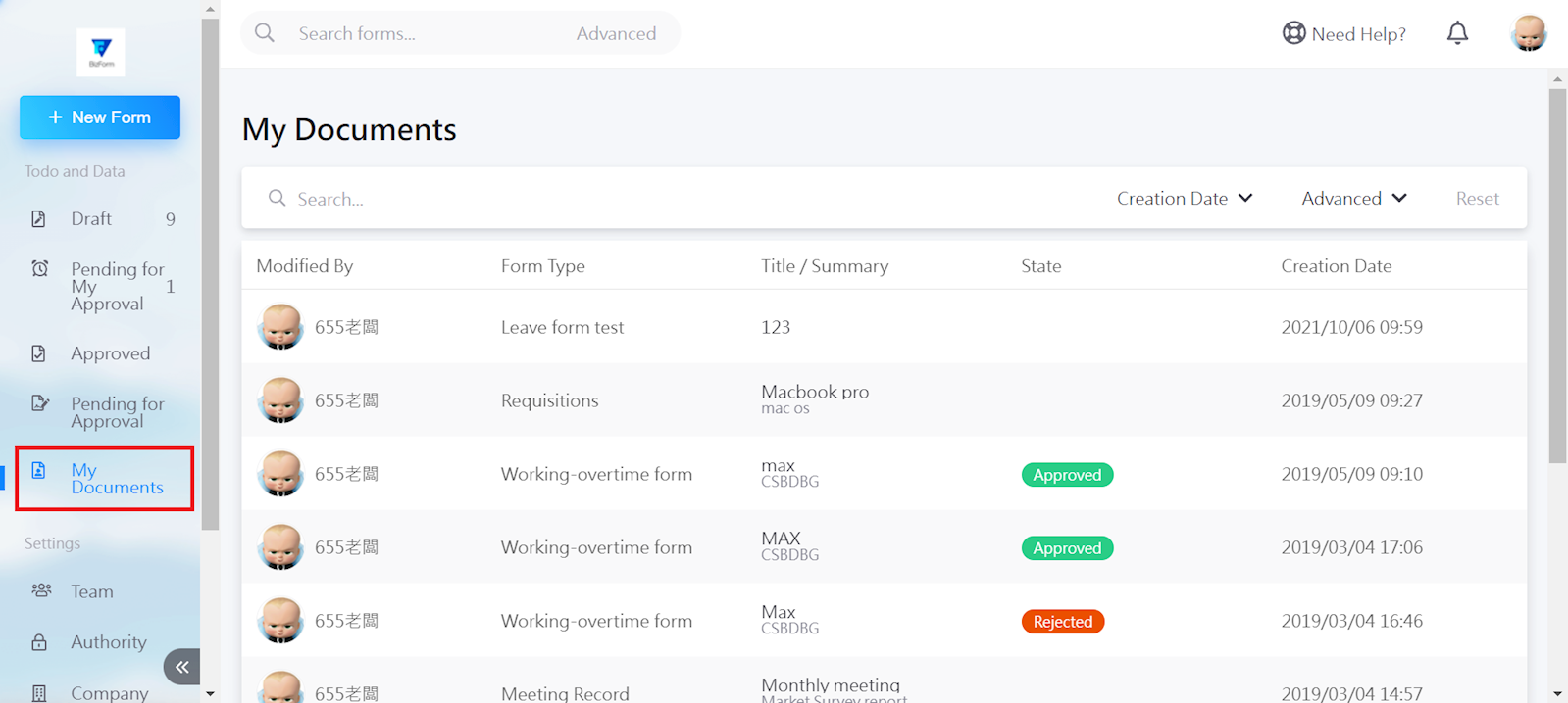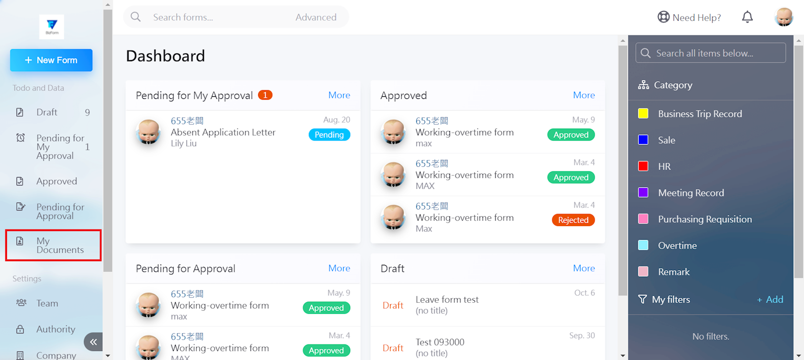 Approval forms can be viewed in the "Pending for Approval" column in the left menu, or in the "Pending for Approval" field on the homepage.