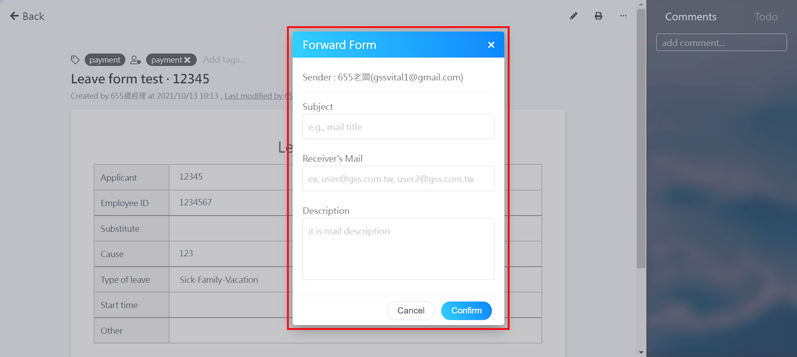 Fill in the subject, receiver's mail, and description, then select [Confirm].