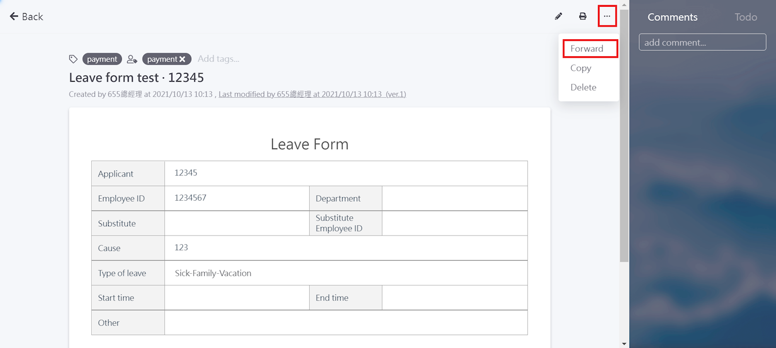 If you wish to forward a form document through email, select the three dots in the top right and choose [Forward].