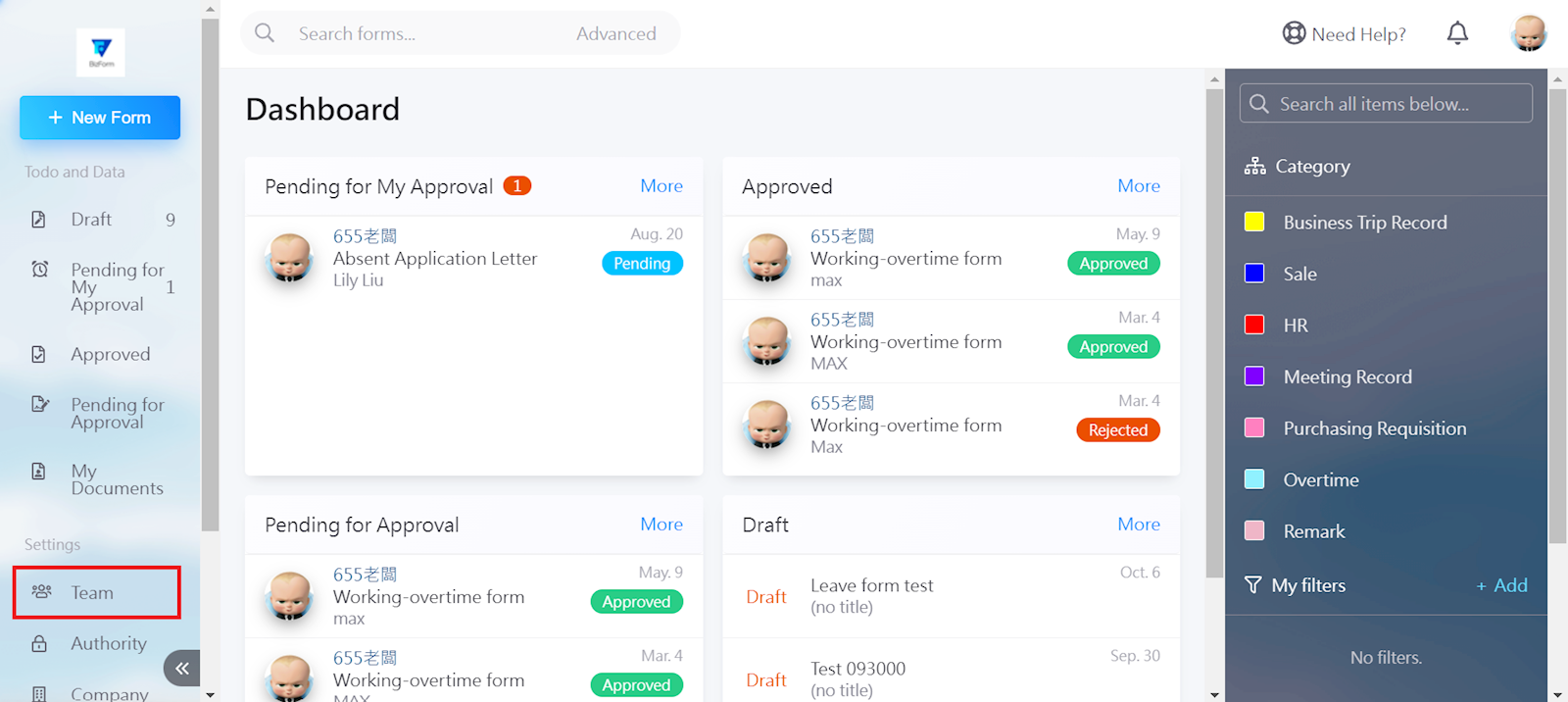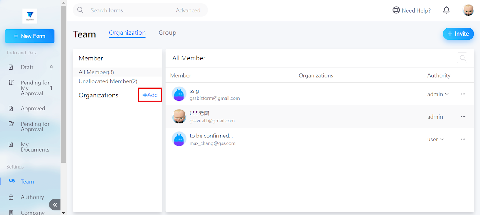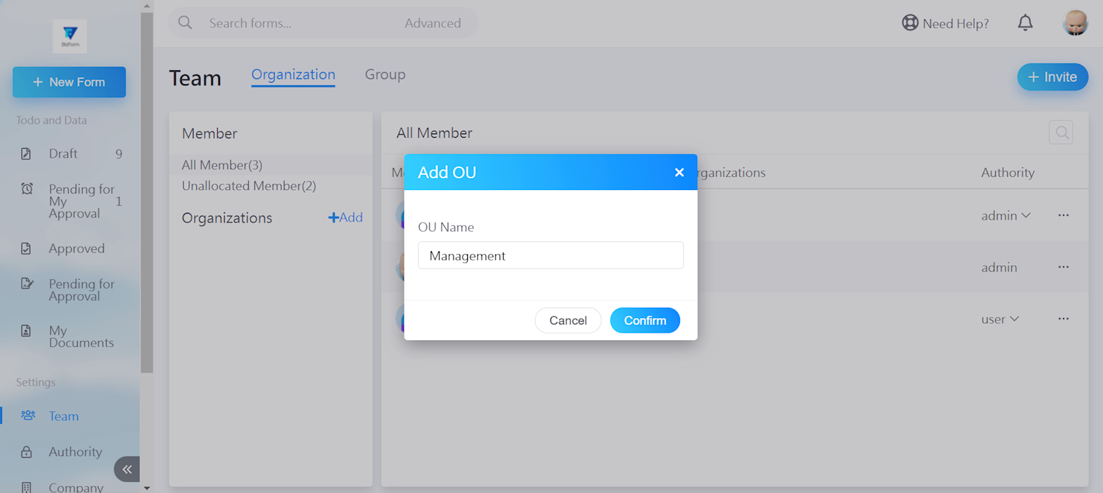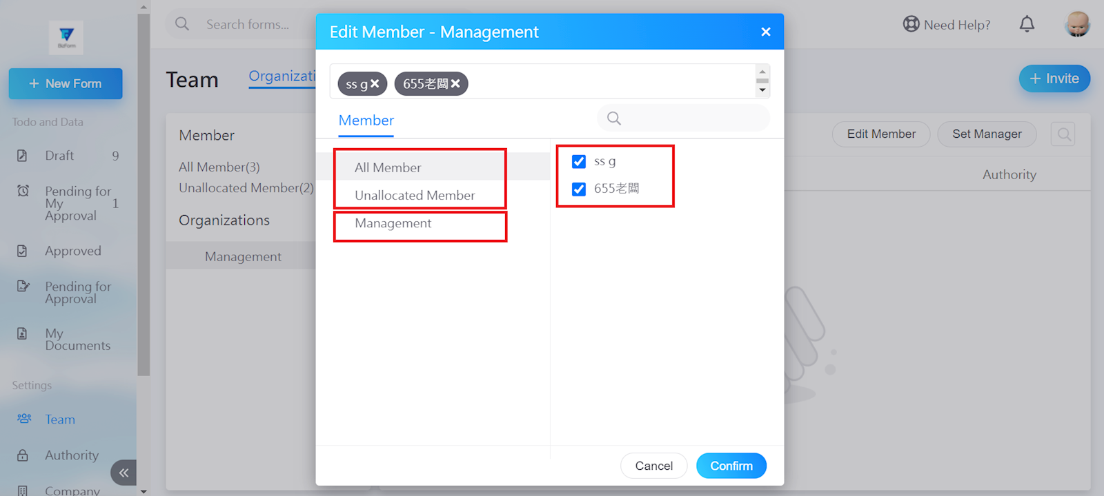 You may start adding members through "All member," "Unallocated member," or other existing organizations. Click [Confirm] when finished.