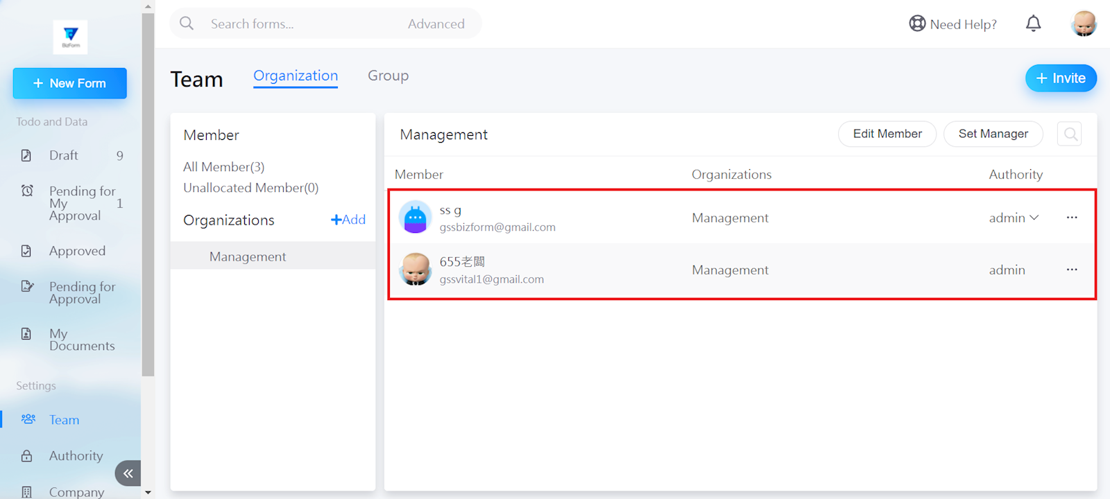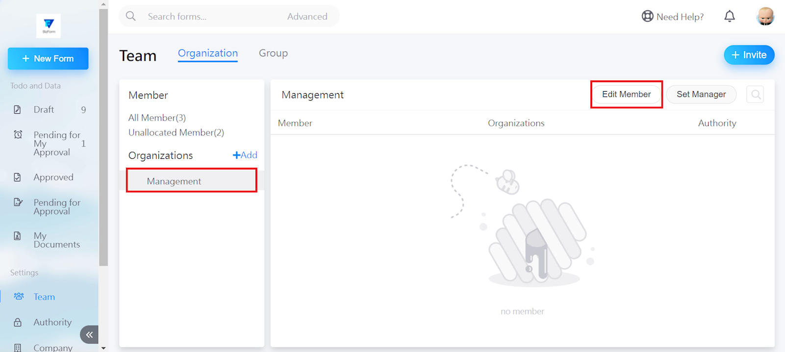 Select the organization, and go to [Edit member] if there are already existing members in the system. (If not, please invite new members first)