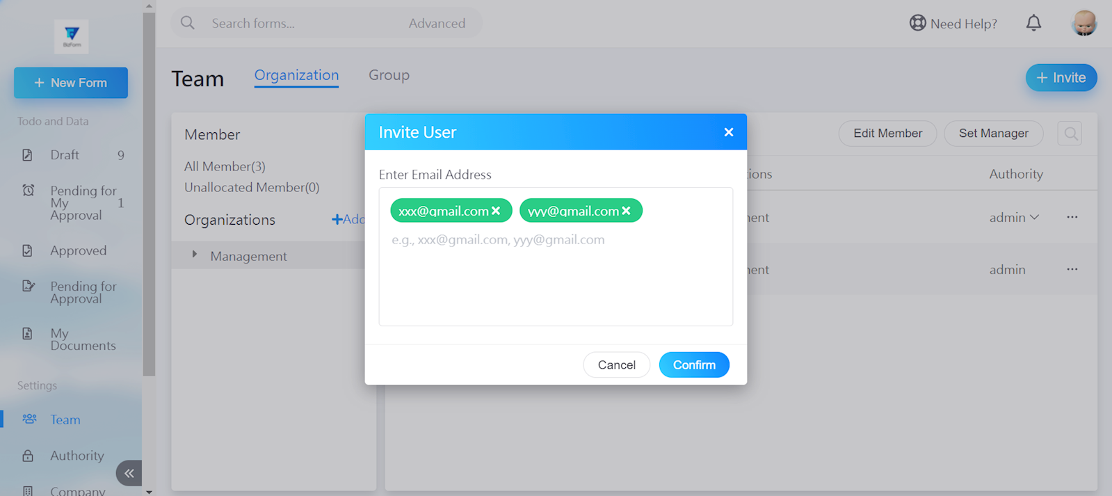 Enter the email of the users you wish to add, then select [Confirm].