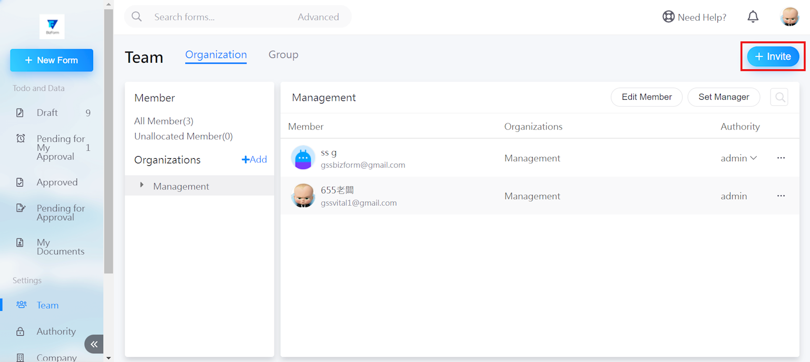 In the Team interface, select [+Invite] in the top right corner.