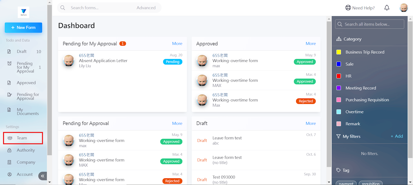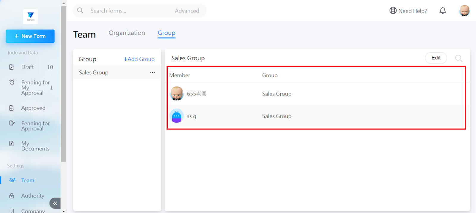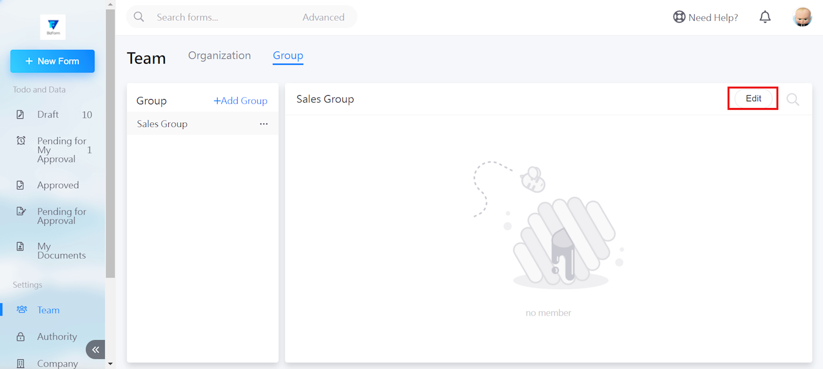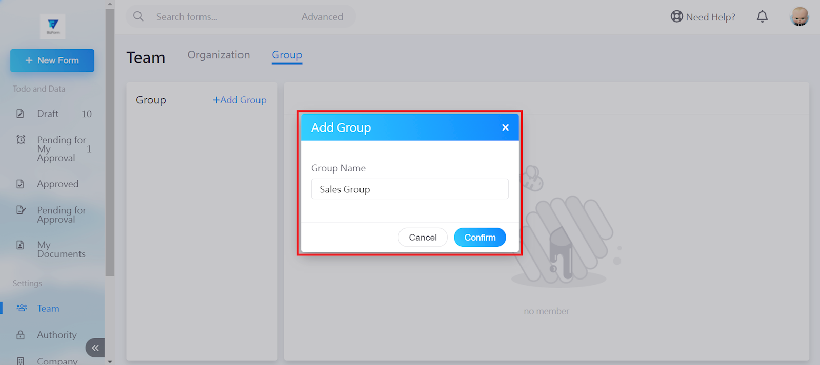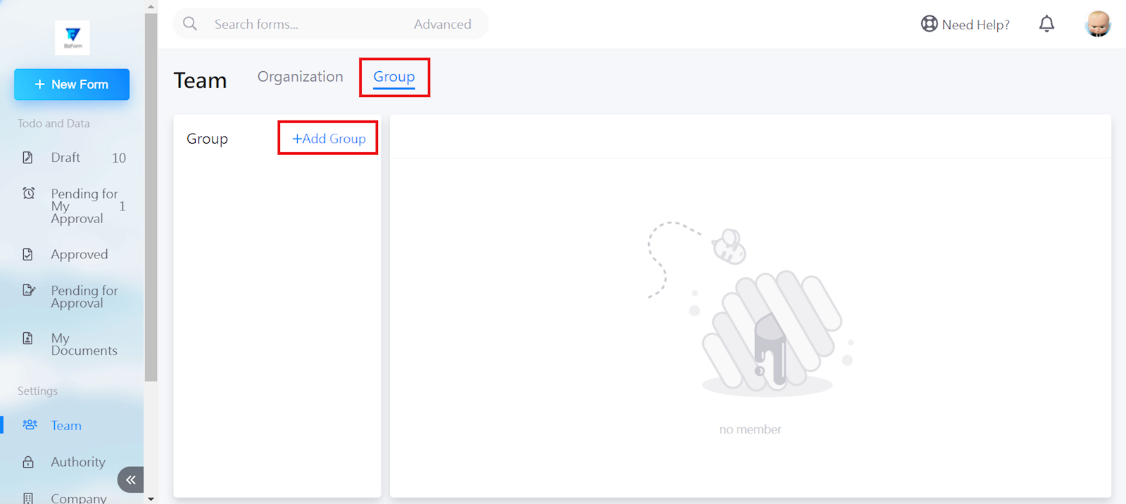 In the Team section, select [Group] in the top tab, then [+Add group].