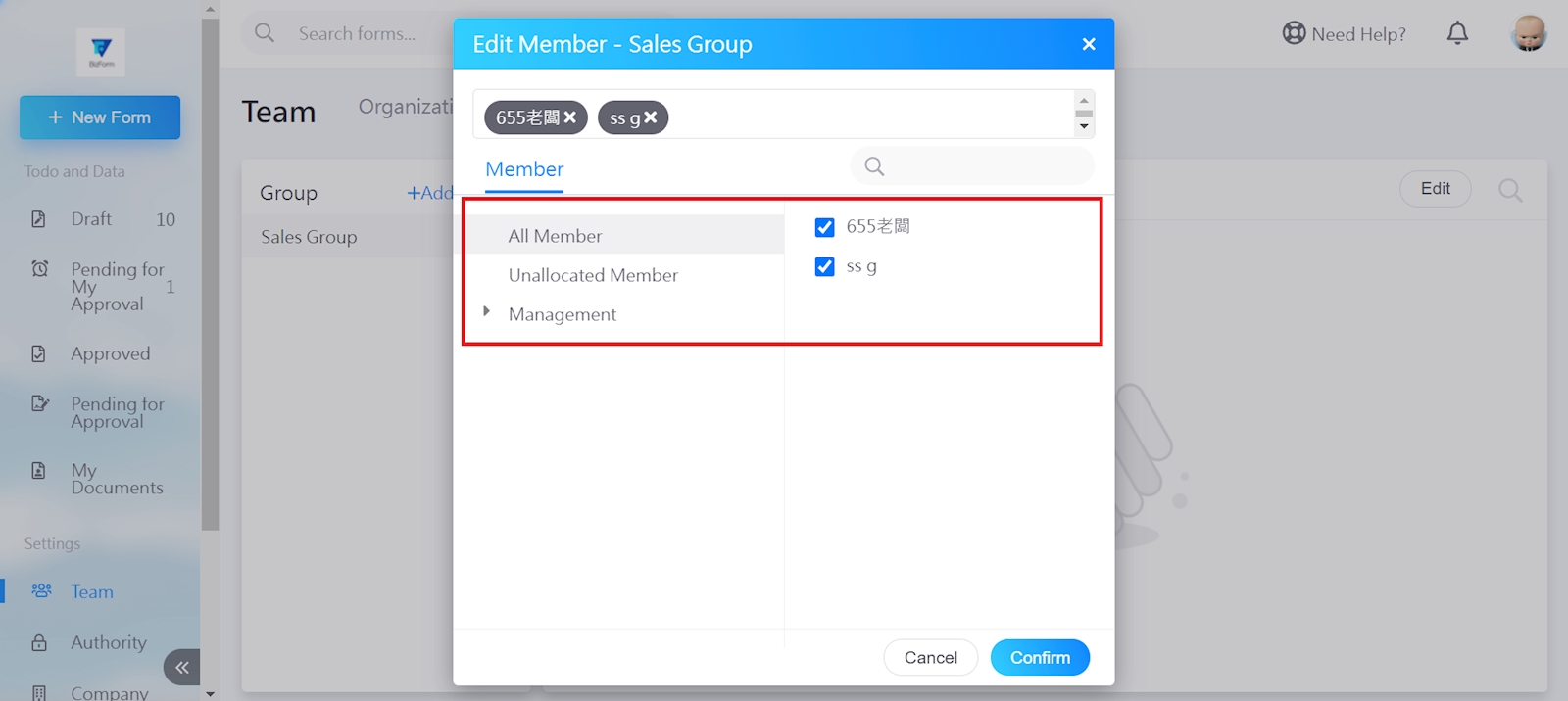Add members from "All Member," "Unallocated Member," or organizations. Once finished, select [Confirm].