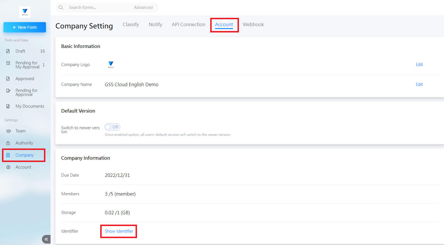 Go to [Company] > [Account] > scroll down to "Company Information" > [Show identifier].