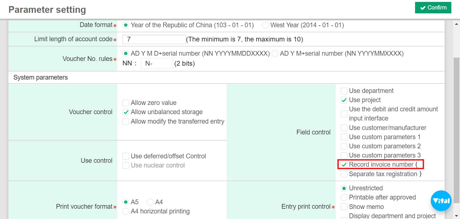 1. Go to [Maintenance] > [Parameter setting] > "Field control" column and check "Record invoice number."