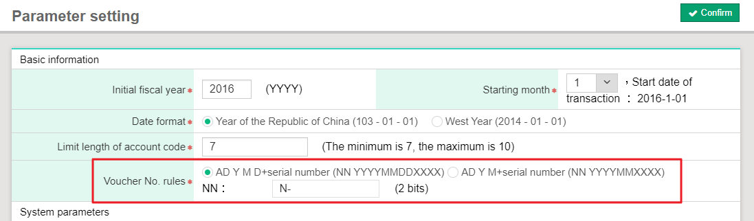 There are two Voucher No. rules. Please click [Maintenance> Parameter setting] to choose Voucher No. rule.