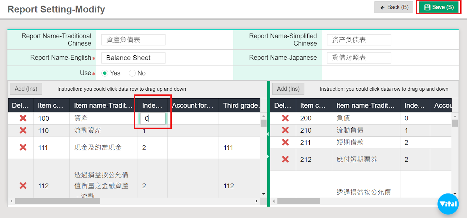 3. After finding the item you wish to edit, click the column under "Indentation" and enter the indentation number. Once finished, don't forget to hit [Save].