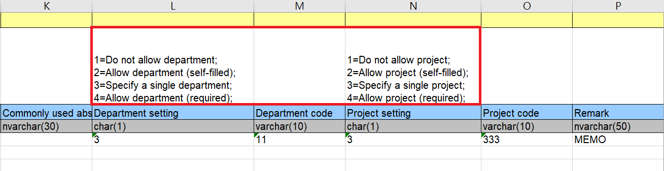 (3) K~P columns: Please pay attention to the instructions in the red box when filling in. The fields may be left blank if there's no need for the settings.