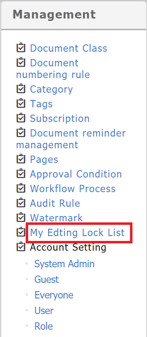 Editing-lock documents: Admin can lock documents, while other members cannot edit documents that are locked. The locked documents are listed in [Management] > [My Editing Lock List]. Only the admin can release them.