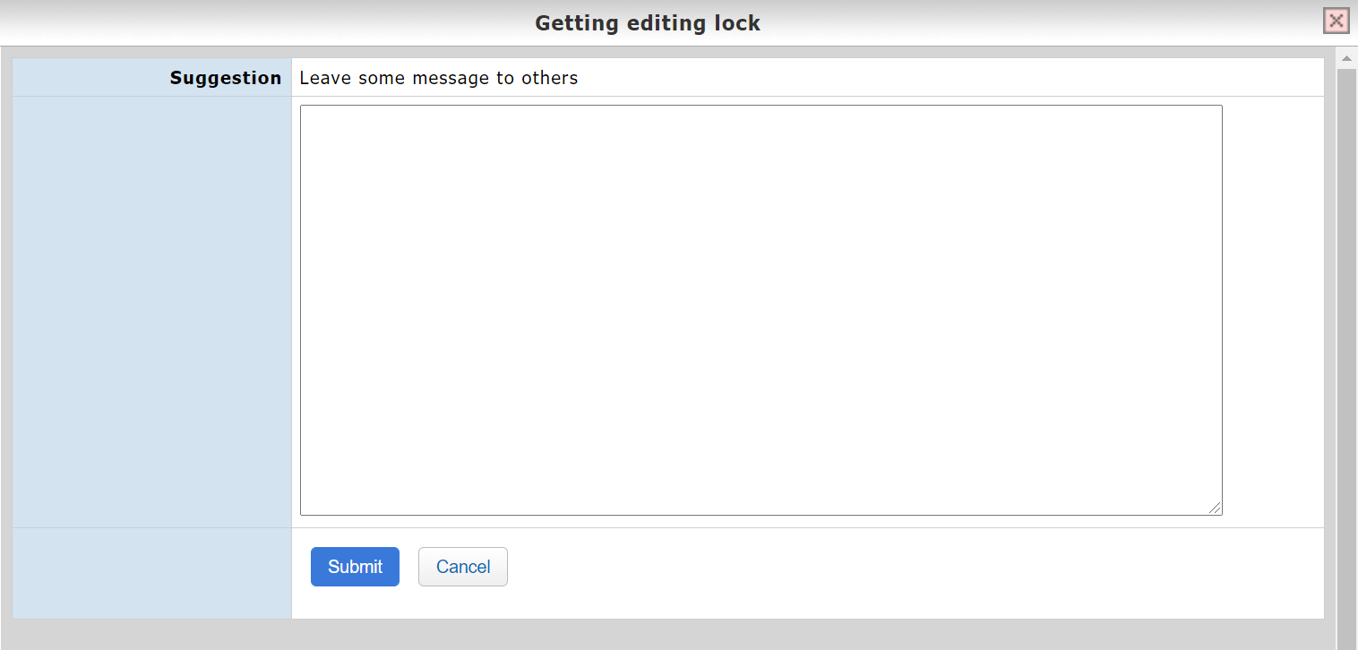Click it, and a pop-up screen will appear. Please enter your reason for getting editing lock.