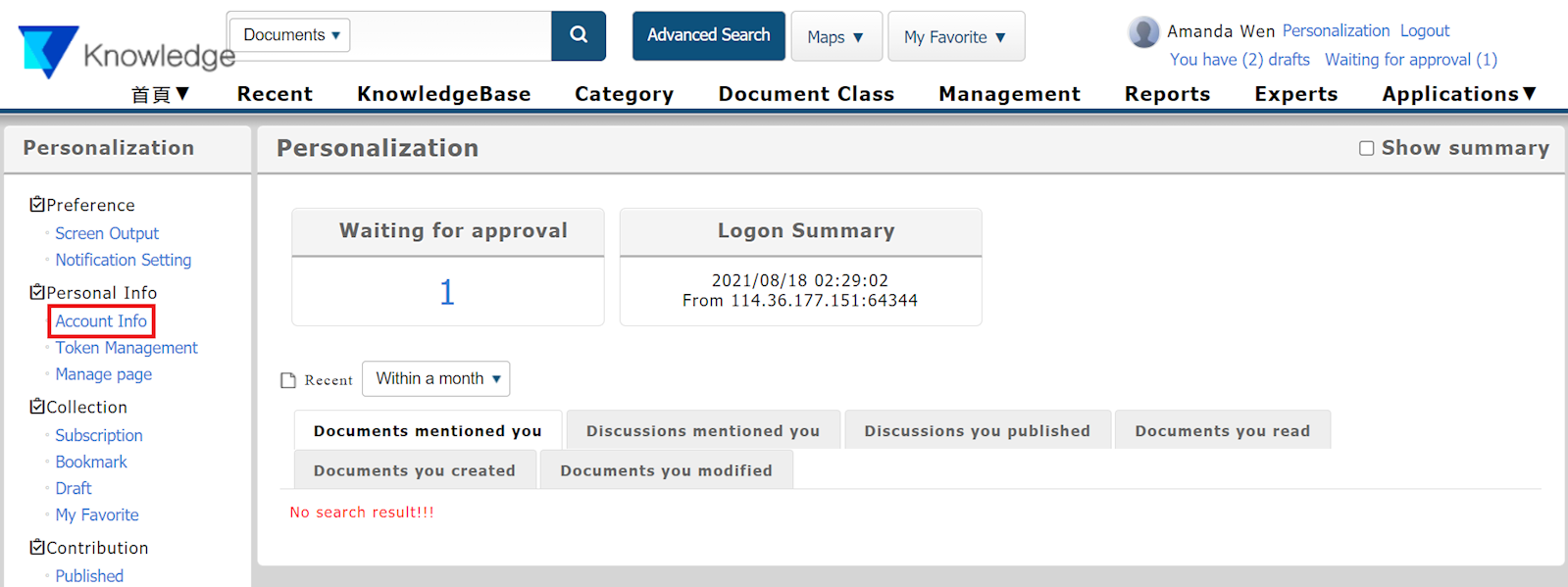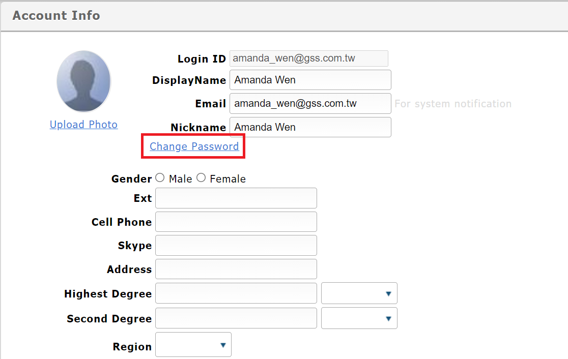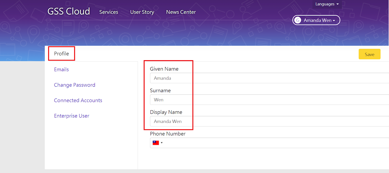 After selecting [Change password], you will enter GSS Cloud account center. Select [Profile], and edit your given name/display name below. Once finished, click [Save] on the top right corner.
