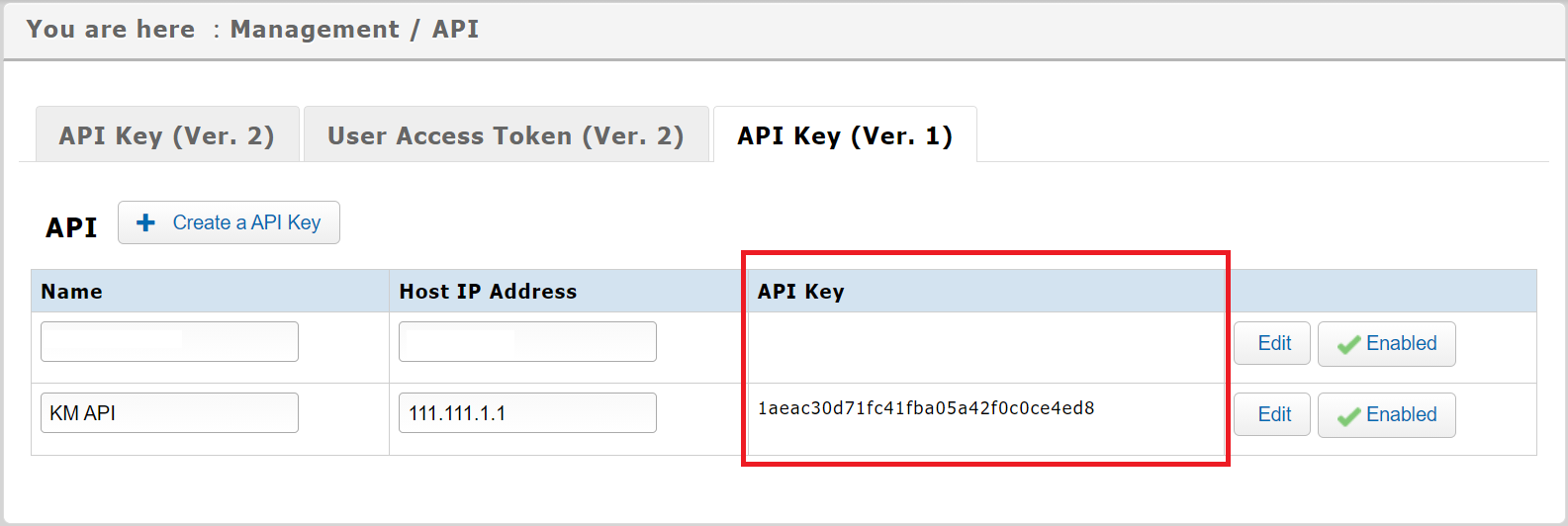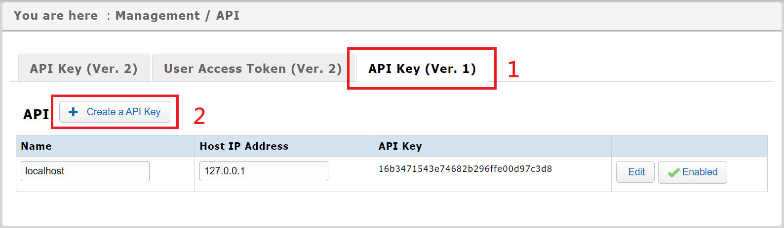 2. Select the "API Key(Ver.1)" tab, and choose [+Create a API Key].