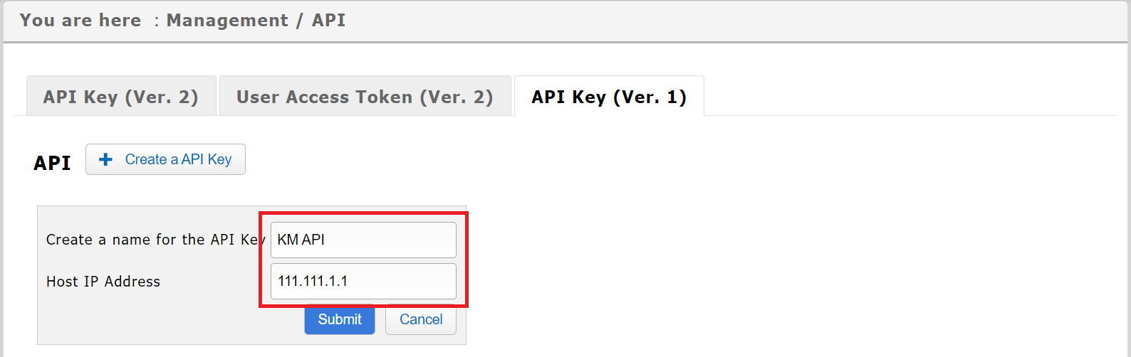 3. Create a name for the API Key, along with a host IP address, then click [Submit].