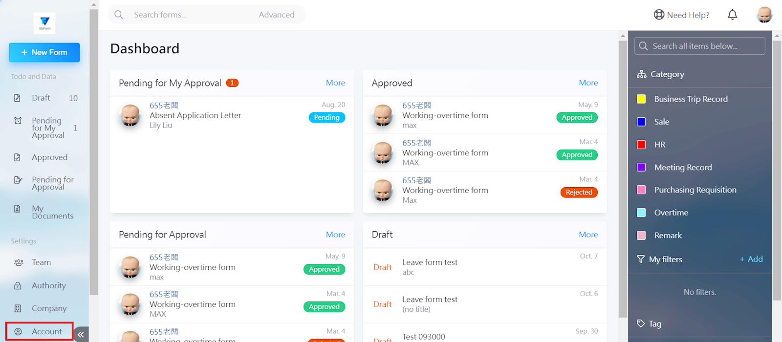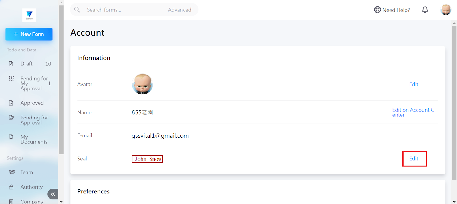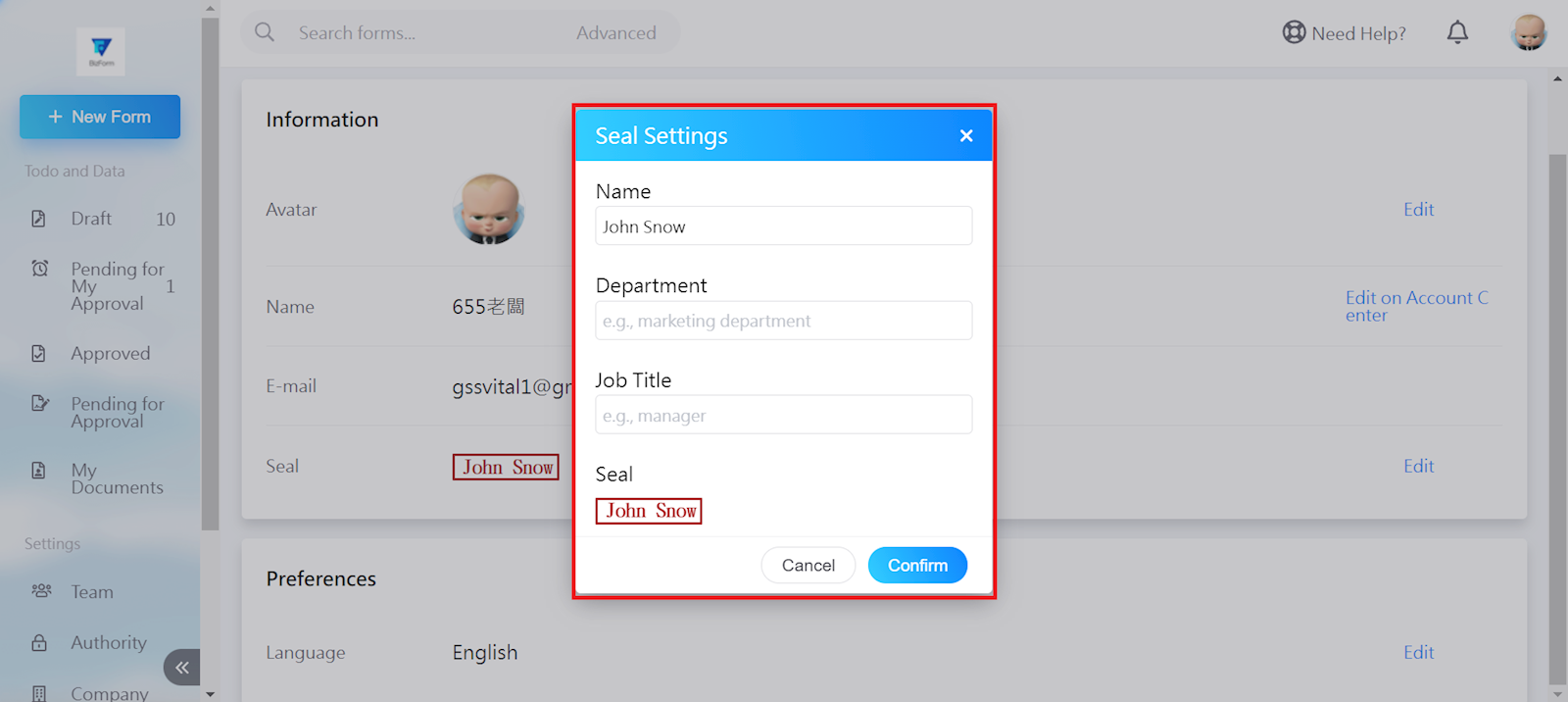 The seal function enables you to show your department, name, title, time, etc. in approval form results. It is presented in the form of a stamp, looking as if an acutal seal was put on the printed documents. Follow the steps below to set up the seal: